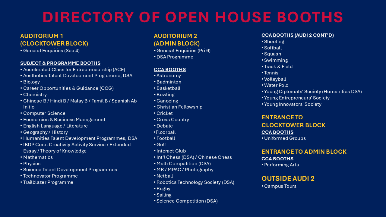 This will be a walk-in event, with no registration required. As there is limited parking in the school, visitors are advised to park their vehicles at the multi-storey carparks nearby.